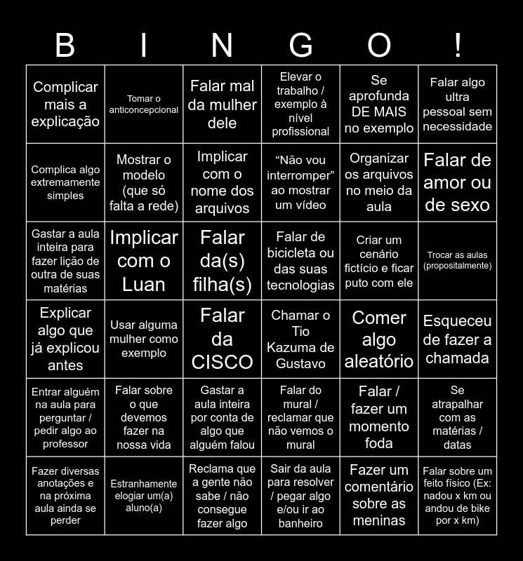 This bingo card has 36 words: Falar do mural / reclamar que não vemos o mural, Gastar a aula inteira por conta de algo que alguém falou, Sair da aula para resolver / pegar algo e/ou ir ao banheiro, Complica algo extremamente simples, Explicar algo que já explicou antes, Falar de bicicleta ou das suas tecnologias, Mostrar o modelo (que só falta a rede), Reclama que a gente não sabe / não consegue fazer algo, Se aprofunda DE MAIS no exemplo, Falar / fazer um momento foda, Falar de amor ou de sexo, Elevar o trabalho / exemplo à nível profissional, Se atrapalhar com as matérias / datas, Implicar com o Luan, “Não vou interromper” ao mostrar um vídeo, Complicar mais a explicação, Entrar alguém na aula para perguntar / pedir algo ao professor, Criar um cenário fictício e ficar puto com ele, Gastar a aula inteira para fazer lição de outra de suas matérias, Falar mal da mulher dele, Falar da(s) filha(s), Usar alguma mulher como exemplo, Chamar o Tio Kazuma de Gustavo, Falar da CISCO, Comer algo aleatório, Tomar o anticoncepcional, Organizar os arquivos no meio da aula, Estranhamente elogiar um(a) aluno(a), Implicar com o nome dos arquivos, Falar algo ultra pessoal sem necessidade, Falar sobre um feito físico (Ex: nadou x km ou andou de bike por x km), Fazer diversas anotações e na próxima aula ainda se perder, Esqueceu de fazer a chamada, Trocar as aulas (propositalmente), Falar sobre o que devemos fazer na nossa vida and Fazer um comentário sobre as meninas.