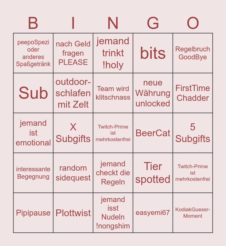 This bingo card has 25 words: interessante Begegnung, Plottwist, Twitch-Prime ist mehrkostenfrei, easyemi67, Regelbruch GoodBye, peepoSpezi oder anderes Spaßgetränk, nach Geld fragen PLEASE, jemand trinkt !holy, BeerCat, Twitch-Prime ist mehrkostenfrei, Sub, outdoor-schlafen mit Zelt, jemand isst Nudeln !nongshim, Tier spotted, FirstTime Chadder, Pipipause, X Subgifts, Team wird klitschnass, neue Währung unlocked, 5 Subgifts, jemand ist emotional, random sidequest, jemand checkt die Regeln, bits and KodiakGuessr-Moment.