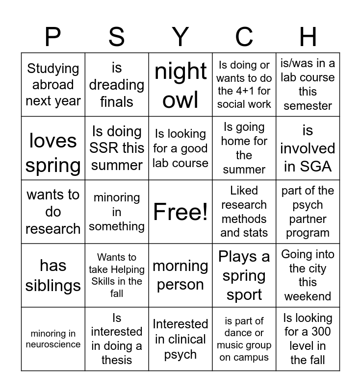 This bingo card has a free space and 24 words: Wants to take Helping Skills in the fall, Is interested in doing a thesis, Is looking for a good lab course, minoring in neuroscience, is/was in a lab course this semester, Studying abroad next year, loves spring, is dreading finals, Liked research methods and stats, morning person, Is going home for the summer, wants to do research, Plays a spring sport, Going into the city this weekend, Is doing SSR this summer, is part of dance or music group on campus, part of the psych partner program, night owl, is involved in SGA, minoring in something, Is looking for a 300 level in the fall, has siblings, Is doing or wants to do the 4+1 for social work and Interested in clinical psych.