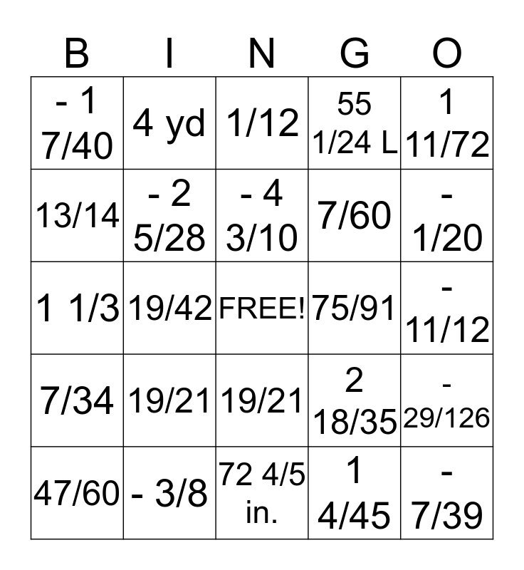 This bingo card has a free space and 24 words: 19/21, - 3/8, - 4 3/10, 47/60, 1 11/72, - 1 7/40, 13/14, 4 yd, 75/91, 19/21, 7/60, 1 1/3, 2 18/35, - 29/126, - 2 5/28, 1 4/45, - 11/12, 1/12, - 1/20, 19/42, - 7/39, 7/34, 55 1/24 L and 72 4/5 in..