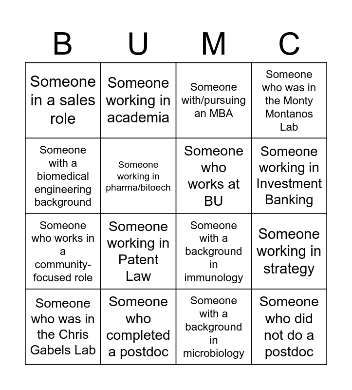 This bingo card has 16 words: Someone who completed a postdoc, Someone working in strategy, Someone with/pursuing an MBA, Someone in a sales role, Someone who works in a community-focused role, Someone working in academia, Someone with a background in immunology, Someone with a background in microbiology, Someone with a biomedical engineering background, Someone working in pharma/bitoech, Someone who was in the Chris Gabels Lab, Someone who was in the Monty Montanos Lab, Someone working in Patent Law, Someone working in Investment Banking, Someone who works at BU and Someone who did not do a postdoc.
