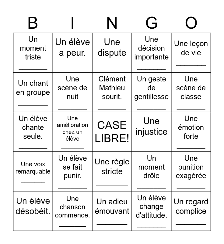 This bingo card has a free space and 24 words: Un élève se fait punir. _______, Une chanson commence. _______, Clément Mathieu sourit. _______, Un élève désobéit. _______, Une leçon de vie _______, Un moment triste _______, Un chant en groupe _______, Un élève a peur. _______, Une injustice _______, Une règle stricte _______, Un geste de gentillesse _______, Un élève chante seule. _______, Un moment drôle _______, Une punition exagérée _______, Une scène de nuit _______, Un élève change d'attitude. _______, Une émotion forte _______, Une dispute _______, Une scène de classe _______, Une amélioration chez un élève _______, Un regard complice _______, Une voix remarquable _______, Une décision importante _______ and Un adieu émouvant _______.