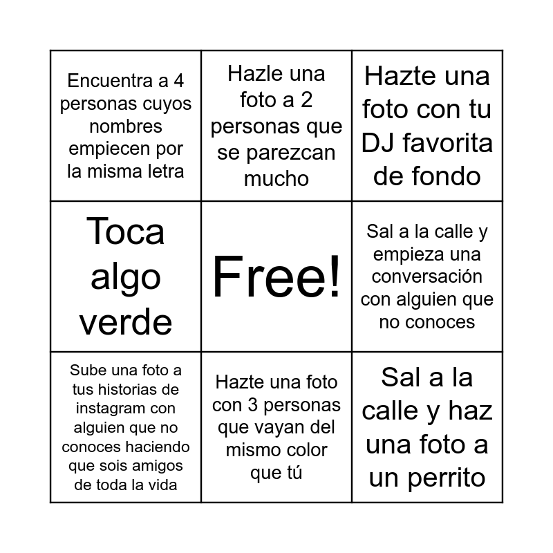 This bingo card has a free space and 11 words: Manda un audio de máximo 20s hablando con alguien cuyo primer idioma no sea el español, Hazte una foto con 3 personas que vayan del mismo color que tú, Sal a la calle y haz una foto a un perrito, Sube una foto a tus historias de instagram con alguien que no conoces haciendo que sois amigos de toda la vida, Hazle una foto a 2 personas que se parezcan mucho, Hazte una foto con tu DJ favorita de fondo, Sal a la calle y empieza una conversación con alguien que no conoces, Presiona tu dedo índice con el de otra persona durante 1 minuto, Toca algo verde, Encuentra a 4 personas cuyos nombres empiecen por la misma letra and Hazte una selfie en un espejo.