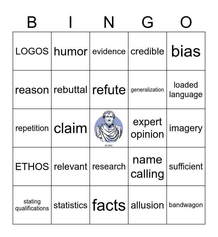 This bingo card has a free space and 37 words: PATHOS, anecdotes, counterclaim, rebuttal, sufficient, relevant, refute, statistics, bias, celebrity endorsement, claim, credible, bandwagon, imagery, reason, ETHOS, stereotyping, evidence, research, expert opinion, LOGOS, loaded language, stating qualifications, facts, common sense, allusion, humor, connotative language, first-person POV, argumentation, persuasive appeals, statistics, repetition, alliteration, name calling, generalization and sources.