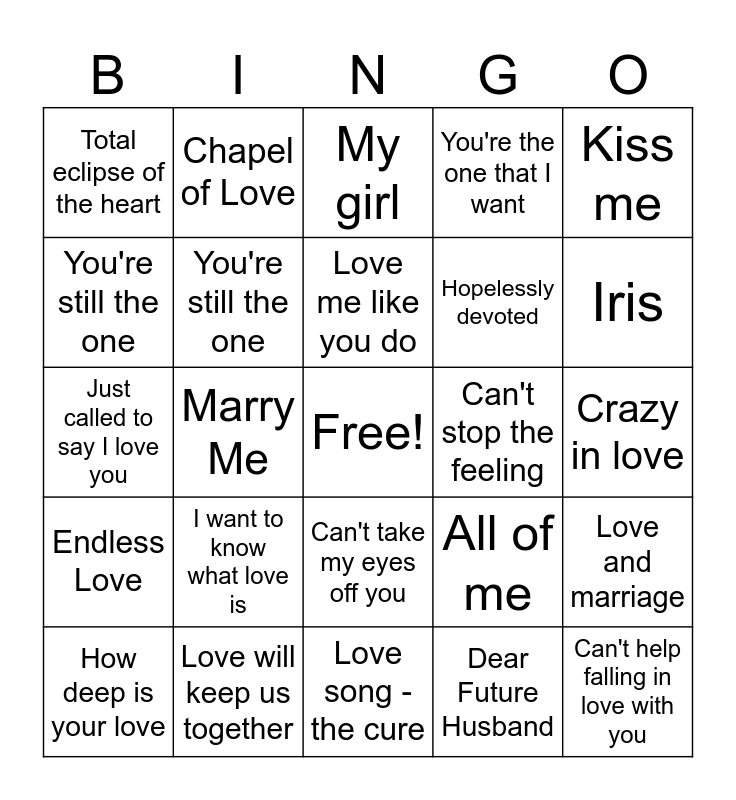 This bingo card has a free space and 32 words: Dear Future Husband, Lover, Marry Me, White Wedding, Endless Love, You're still the one, Kiss me, Love and marriage, Chapel of Love, How sweet it is, Love me like you do, My girl, This Kiss, Perfect, Can't stop the feeling, Wonderful tonight, How deep is your love, Just called to say I love you, Can't take my eyes off you, I want to know what love is, All of me, I will always love you, Crazy in love, Love will keep us together, Can't help falling in love with you, You're the one that I want, Hopelessly devoted, You're still the one, Total eclipse of the heart, Love song - the cure, Take my breath away and Iris.