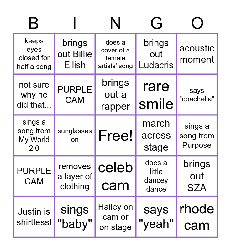 This bingo card has a free space and 29 words: Justin is shirtless!, CROWD SCREAMS BEFORE HE STARTS, sunglasses on, mentions God or Jesus, keeps eyes closed for half a song, does a cover of a female artists' song, PURPLE CAM, removes a layer of clothing, march across stage, sings "baby", sings a song from Purpose, rhode cam, Hailey on cam or on stage, says "yeah", says "coachella", CROWD SINGS LOUDER THAN HIM, celeb cam, PURPLE CAM, acoustic moment, sings a song from My World 2.0, does a little dancey dance, sings 3 songs from SWAG back to back, rare smile, not sure why he did that..., brings out Ludacris, brings out Billie Eilish, brings out SZA, brings out a rapper and brings out Hailey.