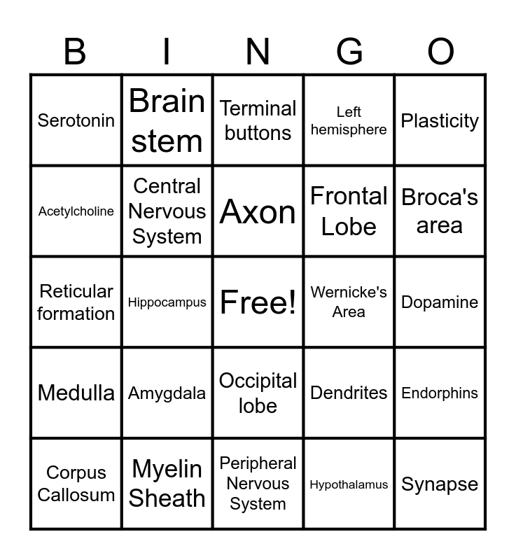 This bingo card has a free space and 24 words: Amygdala, Myelin Sheath, Axon, Corpus Callosum, Plasticity, Serotonin, Acetylcholine, Brain stem, Wernicke's Area, Occipital lobe, Frontal Lobe, Reticular formation, Dendrites, Endorphins, Central Nervous System, Hypothalamus, Dopamine, Terminal buttons, Broca's area, Hippocampus, Synapse, Medulla, Left hemisphere and Peripheral Nervous System.