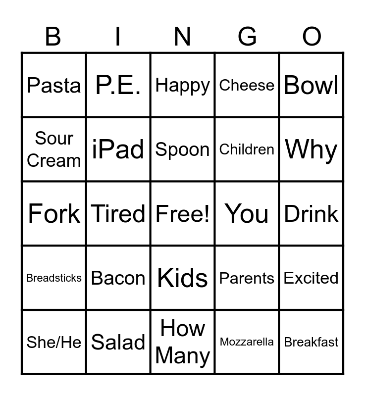 This bingo card has a free space and 80 words: Number 25, Door, Happy, Sad, Bored, Mad, Cold, What's Up, How are you, Nice to meet you, Ready, Potato, Cheese, Pasta, Salad, Sour Cream, Chopped, Bacon, Eat, Drink, Plate, Bowl, Fork, Spoon, iPad, Internet, Computer, Go, What, When, Why, How, How Many, I/Me, She/He, You, Desk, Light, Bus, Breakfast, Lunch, Bathroom, Music, Math, Science, P.E., Walk, Run, Old, Know, Excited, Tired, Parents, Sister, Brother, Son, Grandpa, Twins, Cousins, Kids, Children, Aunt, Uncle, Niece, Yes, No, Stop, Fire Drill, Chicken, Sausage, Breadsticks, Salad, Cake, Meatballs, Soda, Water, Mozzarella, Alfredo, Marinara and Sauce.