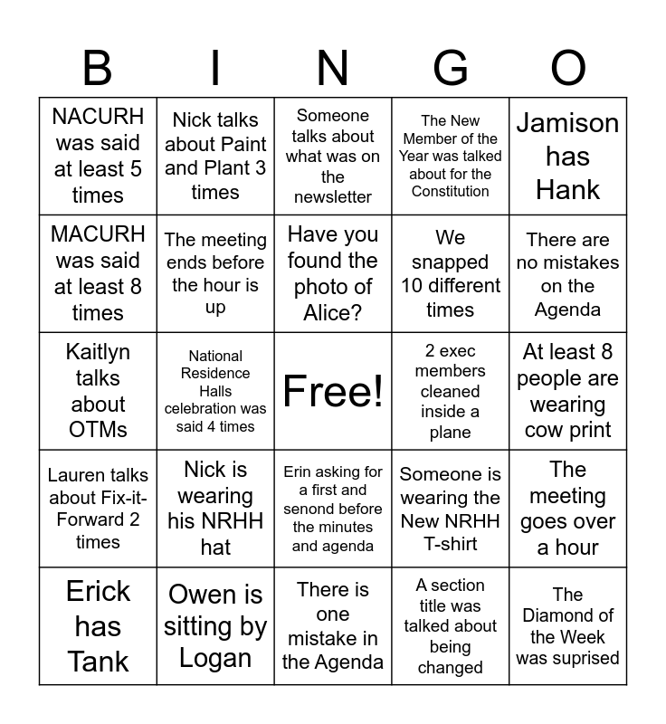 This bingo card has a free space and 25 words: Nick is wearing his NRHH hat, There is one mistake in the Agenda, Have you found the photo of Alice?, Erick has Tank, Jamison has Hank, NACURH was said at least 5 times, MACURH was said at least 8 times, Nick talks about Paint and Plant 3 times, 2 exec members cleaned inside a plane, Erin asking for a first and senond before the minutes and agenda, We snapped 10 different times, Kaitlyn talks about OTMs, Someone is wearing the New NRHH T-shirt, The meeting goes over a hour, The meeting ends before the hour is up, The meeting started at 8:30pm, At least 8 people are wearing cow print, Someone talks about what was on the newsletter, There are no mistakes on the Agenda, National Residence Halls celebration was said 4 times, The Diamond of the Week was suprised, Owen is sitting by Logan, Lauren talks about Fix-it-Forward 2 times, The New Member of the Year was talked about for the Constitution and A section title was talked about being changed.
