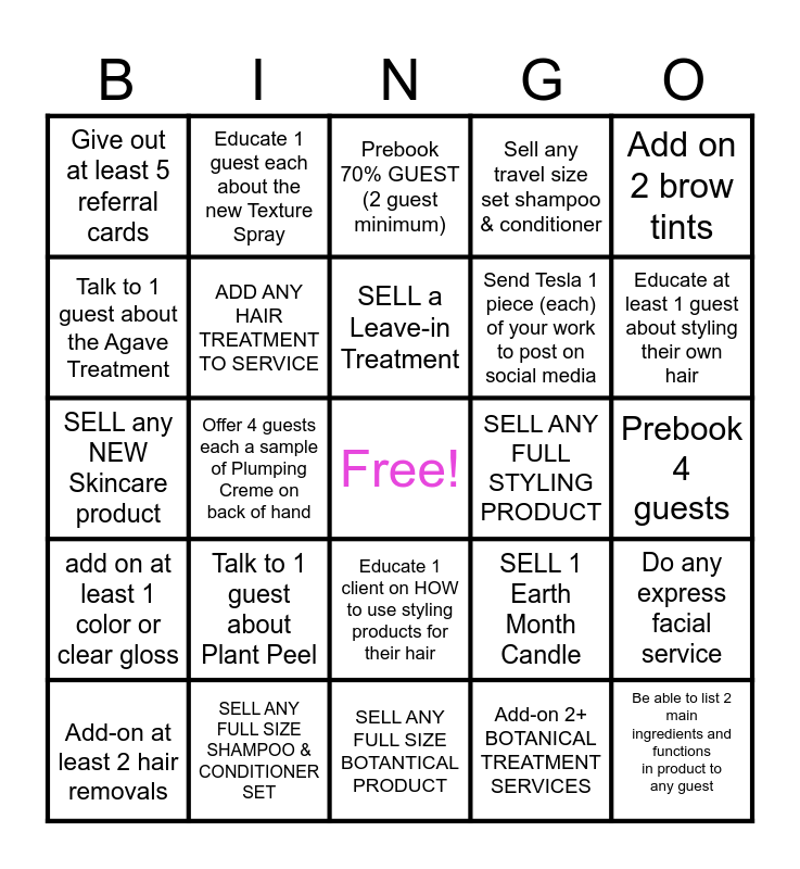 This bingo card has a free space and 24 words: Add-on at least 2 hair removals, Talk to 1 guest about Plant Peel, SELL a Leave-in Treatment, Add-on 2+ BOTANICAL TREATMENT SERVICES, Add on 2 brow tints, Give out at least 5 referral cards, Educate 1 guest each about the new Texture Spray, Prebook 70% GUEST (2 guest minimum), SELL ANY FULL STYLING PRODUCT, Prebook 4 guests, SELL any NEW Skincare product, ADD ANY HAIR TREATMENT TO SERVICE, SELL 1 Earth Month Candle, Do any express facial service, Talk to 1 guest about the Agave Treatment, SELL ANY FULL SIZE SHAMPOO & CONDITIONER SET, SELL ANY FULL SIZE BOTANTICAL PRODUCT, Sell any travel size set shampoo & conditioner, Educate at least 1 guest about styling their own hair, add on at least 1 color or clear gloss, Offer 4 guests each a sample of Plumping Creme on back of hand, Educate 1 client on HOW to use styling products for their hair, Send Tesla 1 piece (each) of your work to post on social media and Be able to list 2 main ingredients and functions in product to any guest.