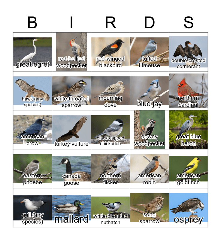 This bingo card has 24 images, a free space and 24 words: canada goose, mallard, mourning dove, gull (any species), double-crested cormorant, great egret, hawk (any species), red-bellied woodpecker, downy woodpecker, northern flicker, blue jay, american crow, american robin, american goldfinch, white-throated sparrow, song sparrow, great blue heron, red-winged blackbird, northern cardinal, turkey vulture, osprey, eastern phoebe, tufted titmouse and white-breasted nuthatch.