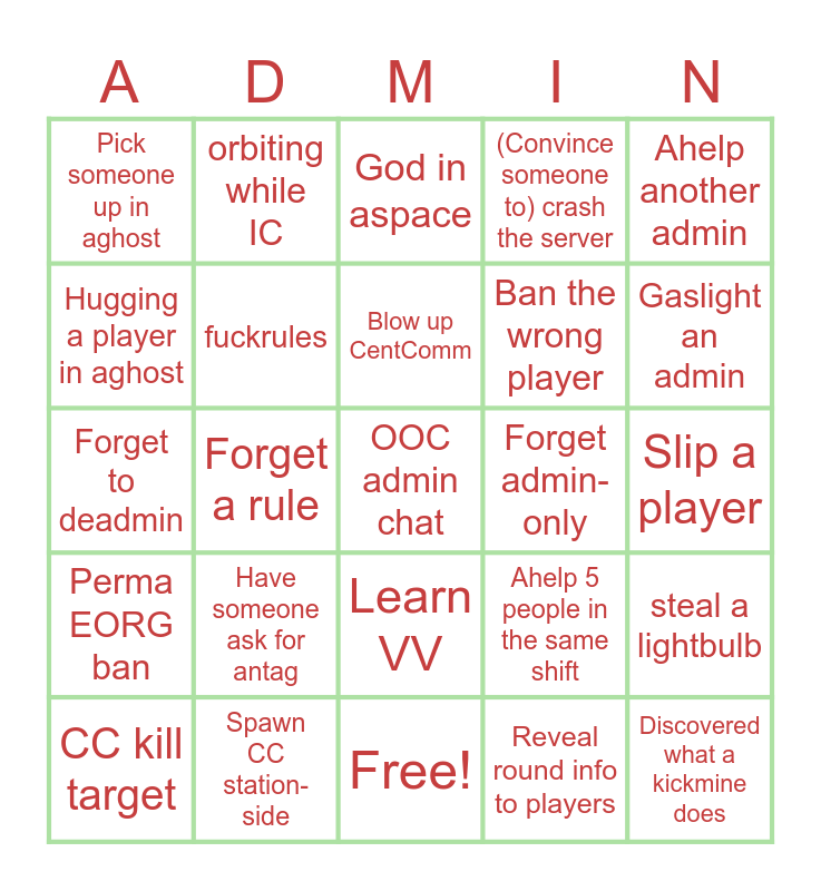 This bingo card has 25 words: Perma EORG ban, Spawn CC station-side, OOC admin chat, Reveal round info to players, Ahelp another admin, Pick someone up in aghost, orbiting while IC, God in aspace, Forget admin-only, steal a lightbulb, Hugging a player in aghost, fuckrules, Free!, Ahelp 5 people in the same shift, Gaslight an admin, CC kill target, Forget a rule, Blow up CentComm, Ban the wrong player, Slip a player, Forget to deadmin, Have someone ask for antag, Learn VV, (Convince someone to) crash the server and Discovered what a kickmine does.