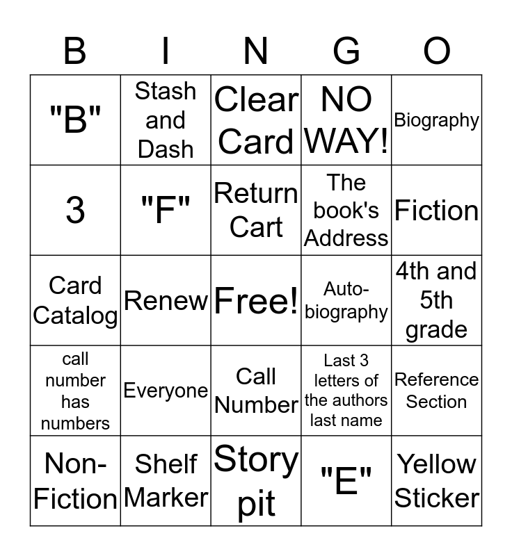 This bingo card has a free space and 24 words: Everyone, Shelf Marker, Return Cart, Non-Fiction, Biography, "B", 3, Stash and Dash, Auto-biography, Call Number, The book's Address, Card Catalog, Last 3 letters of the authors last name, Reference Section, "F", "E", 4th and 5th grade, Clear Card, Fiction, Renew, Yellow Sticker, call number has numbers, NO WAY! and Story pit.