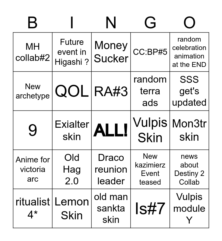 This bingo card has a free space and 24 words: Old Hag 2.0, Lemon Skin, RA#3, ritualist 4*, random celebration animation at the END, MH collab#2, New archetype, Future event in Higashi ?, Vulpis Skin, Draco reunion leader, random terra ads, 9, New kazimierz Event teased, news about Destiny 2 Collab, QOL, Is#7, Mon3tr skin, Money Sucker, SSS get's updated, Exialter skin, Vulpis module Y, Anime for victoria arc, CC:BP#5 and old man sankta skin.