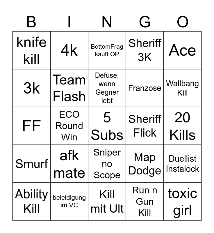 This bingo card has a free space and 24 words: afk mate, beleidigung im VC, Defuse, wenn Gegner lebt, Ability Kill, Ace, knife kill, 3k, 4k, Sheriff Flick, Sniper no Scope, Franzose, FF, Map Dodge, Duellist Instalock, Team Flash, Run n Gun Kill, 20 Kills, BottomFrag kauft OP, Wallbang Kill, ECO Round Win, toxic girl, Smurf, Sheriff 3K and Kill mit Ult.