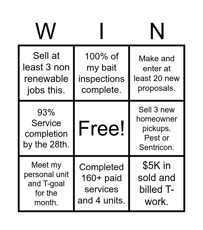 This bingo card has a free space and 8 words: Sell 3 new homeowner pickups. Pest or Sentricon., Make and enter at least 20 new proposals., 100% of my bait inspections complete., Meet my personal unit and T-goal for the month., Sell at least 3 non renewable jobs this., $5K in sold and billed T-work., 93% Service completion by the 28th. and Completed 160+ paid services and 4 units..