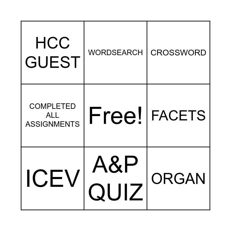 This bingo card has a free space and 8 words: FACETS, CROSSWORD, WORDSEARCH, ICEV, HCC GUEST, ORGAN, COMPLETED ALL ASSIGNMENTS and A&P QUIZ.