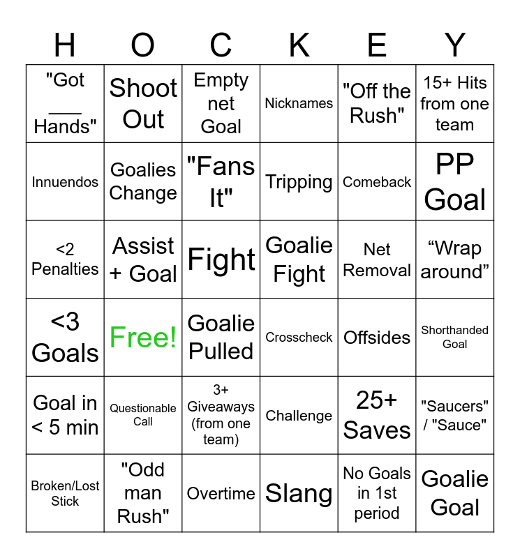 This bingo card has 51 words: 6+ Penalties, <2 Penalties, Icing, Offsides, Net Removal, Overtime, Shoot Out, Fight, Goal and Assist, 15+ Hits from one team, Slang, Innuendos, Nicknames, Free!, <3 Goals, 25+ SoG, 25+ Saves, Goalies Change, Assist + Goal, Own Goal, "Off the Rush", PP Goal, Shorthanded Goal, "Got ___ Hands", "Fans It", "Tape to Tape", Goal in < 5 min, Tripping, Boarding, Goalie Pulled, Empty net Goal, Breakaway, "Saucers" / "Sauce", Takeaway, "Skate to Stick", "Odd man Rush", Crosscheck, 3+ Giveaways (from one team), No Goals in 1st period, Goalie Goal, Hat Trick, Fight, Goalie Fight, Shut Out, 4+ Goals, Questionable Call, Challenge, Comeback, Broken/Lost Stick, 10+ blocked shots, “Wrap around” and Four on Four.