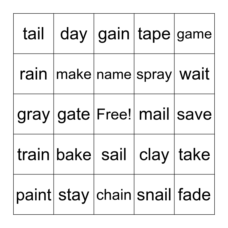 This bingo card has a free space and 37 words: Baby, Sail, cake, make, take, bake, name, same, game, late, gate, tape, fade, save, rain, train, pain, gain, sail, mail, tail, wait, paint, chain, brain, snail, day, play, say, way, may, stay, gray, tray, clay, spray and away.