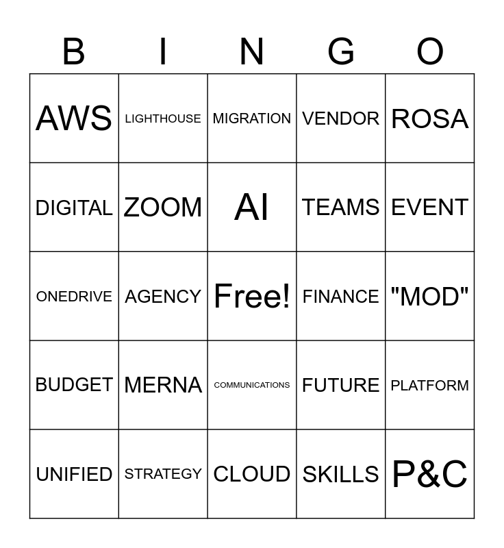 This bingo card has a free space and 24 words: MERNA, STRATEGY, AI, UNIFIED, ROSA, AWS, DIGITAL, LIGHTHOUSE, FINANCE, COMMUNICATIONS, TEAMS, ONEDRIVE, FUTURE, PLATFORM, ZOOM, SKILLS, "MOD", MIGRATION, EVENT, AGENCY, P&C, BUDGET, VENDOR and CLOUD.