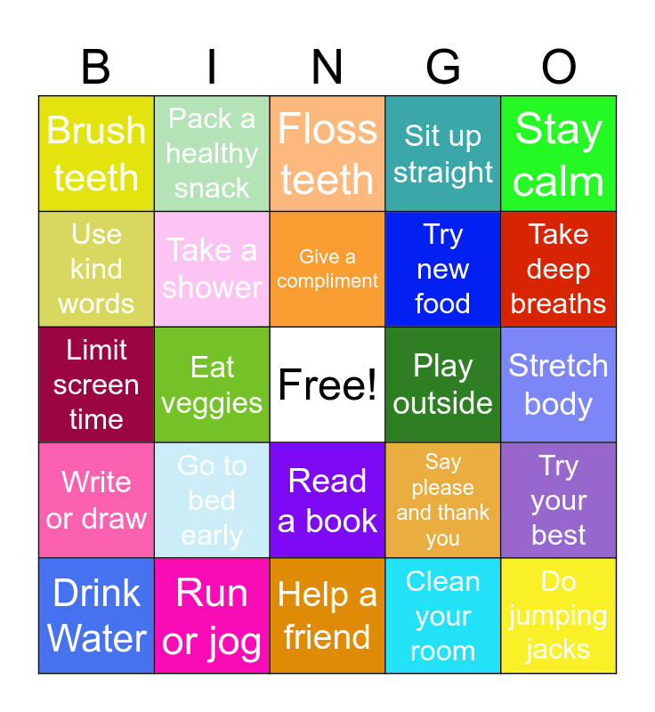 This bingo card has a free space and 29 words: Drink Water, Eat fruit, Eat veggies, Wash hands, Brush teeth, Floss teeth, Take a shower, Go to bed early, Play outside, Run or jog, Stretch body, Do jumping jacks, Help a friend, Clean your room, Take deep breaths, Share toys, Read a book, Write or draw, Stay calm, Limit screen time, Say please and thank you, Wear a helmet, Try new food, Use kind words, Sit up straight, Pack a healthy snack, Try your best, Give a compliment and Do sit-ups.