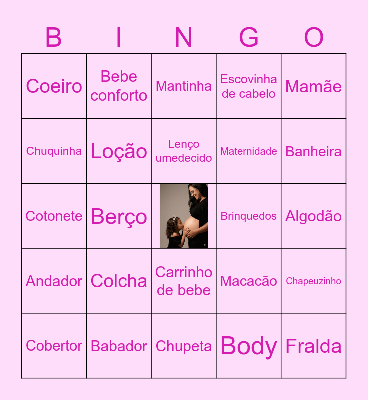 This bingo card has a free space and 24 words: Colcha, Babador, Lenço umedecido, Cobertor, Mamãe, Coeiro, Chuquinha, Bebe conforto, Brinquedos, Carrinho de bebe, Maternidade, Cotonete, Macacão, Chapeuzinho, Loção, Body, Algodão, Mantinha, Banheira, Berço, Fralda, Andador, Escovinha de cabelo and Chupeta.