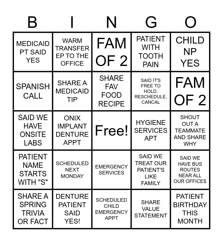 This bingo card has a free space and 24 words: SCHEDULED NEXT MONDAY, DENTURE PATIENT SAID YES!, SHARE FAV FOOD RECIPE, SHARE A SPRING TRIVIA OR FACT, CHILD NP YES, MEDICAID PT SAID YES, SPANISH CALL, WARM TRANSFER EP TO THE OFFICE, HYGIENE SERVICES APT, EMERGENCY SERVICES, SAID IT'S FREE TO HOLD, RESCHEDULE, CANCAL, SAID WE HAVE ONSITE LABS, SAID WE TREAT OUR PATIENT'S LIKE FAMILY, SAID WE HAVE BUS ROUTES NEAR ALL OUR OFFICES, SHARE A MEDICAID TIP, SHARE VALUE STATEMENT, SHOUT OUT A TEAMMATE AND SHARE WHY, FAM OF 2, FAM OF 2, ONIX IMPLANT DENTURE APPT, PATIENT BIRTHDAY THIS MONTH, PATIENT NAME STARTS WITH "S", PATIENT WITH TOOTH PAIN and SCHEDULED CHILD EMERGENCY APPT.