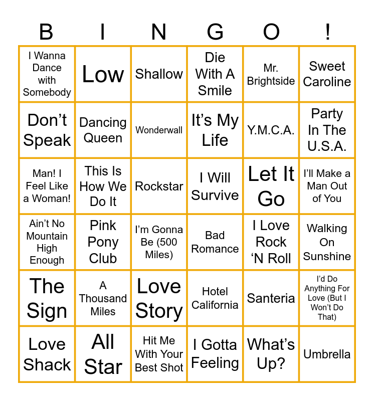This bingo card has 66 words: Free!, Santeria, Margaritaville, Pink Pony Club, A Thousand Miles, Ice Ice Baby, Low, Unstoppable, Dancing Queen, Take Me Home, Country Roads, I’ll Make a Man Out of You, Don’t Stop Believin’, Rockstar, Mr. Brightside, Bohemian Rhapsody, Sweet Caroline, Party In The U.S.A., I Wanna Dance with Somebody, Wannabe, Wonderwall, Let It Go, I Will Survive, Die With A Smile, Love Shack, Girls Just Want to Have Fun, What’s Up?, Hit Me With Your Best Shot, I Want It That Way, Man! I Feel Like a Woman!, I Will Always Love You, I’m Gonna Be (500 Miles), Respect, Hold On, Sweet Home Alabama, Ain’t No Mountain High Enough, Bad Romance, (I’ve Had) The Time of My Life, Y.M.C.A., Walking On Sunshine, Umbrella, Don’t Speak, Love Story, This Is How We Do It, Happy, Rolling in the Deep, All Star, It’s My Life, Uptown Girl, The Sign, Hotel California, Dream On, Shake It Off, Wake Me Up Before You Go-Go, Since U Been Gone, Karma Chameleon, I’d Do Anything For Love (But I Won’t Do That), Sweet Child O’ Mine, I Don’t Want to Miss a Thing, Shallow, I Love Rock ‘N Roll, I Gotta Feeling, Come On Eileen, My Way, How Deep Is Your Love, Summer Nights and Mamma Mia.