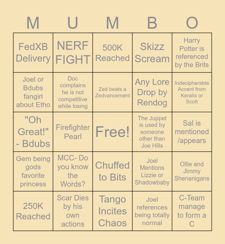 This bingo card has a free space and 24 words: MCC- Do you know the Words?, Scar Dies by his own actions, Zed beats a Zedvancement, 250K Reached, Harry Potter is referenced by the Brits, FedXB Delivery, Joel or Bdubs fangirl about Etho, NERF FIGHT, The Juppet is used by someone other than Joe Hills, Chuffed to Bits, Any Lore Drop by Rendog, "Oh Great!" - Bdubs, Joel Mentions Lizzie or Shadowbaby, Ollie and Jimmy Shenanigans, Doc complains he is not competitive while losing, Joel references being totally normal, Sal is mentioned /appears, 500K Reached, Indecipherable Accent from Keralis or Scott, Firefighter Pearl, C-Team manage to form a C, Gem being gods favorite princess, Skizz Scream and Tango Incites Chaos.