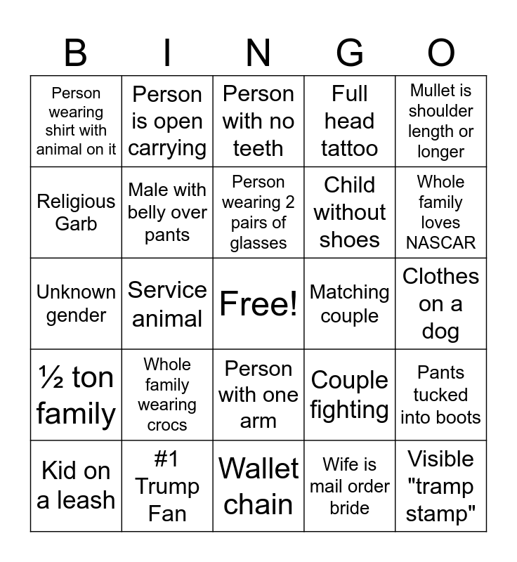 This bingo card has a free space and 24 words: Kid on a leash, Whole family wearing crocs, Person wearing 2 pairs of glasses, Wife is mail order bride, Mullet is shoulder length or longer, Person wearing shirt with animal on it, Person is open carrying, Person with no teeth, Matching couple, Clothes on a dog, Unknown gender, Male with belly over pants, Couple fighting, Pants tucked into boots, Religious Garb, #1 Trump Fan, Wallet chain, Full head tattoo, Whole family loves NASCAR, ½ ton family, Service animal, Person with one arm, Child without shoes and Visible "tramp stamp".