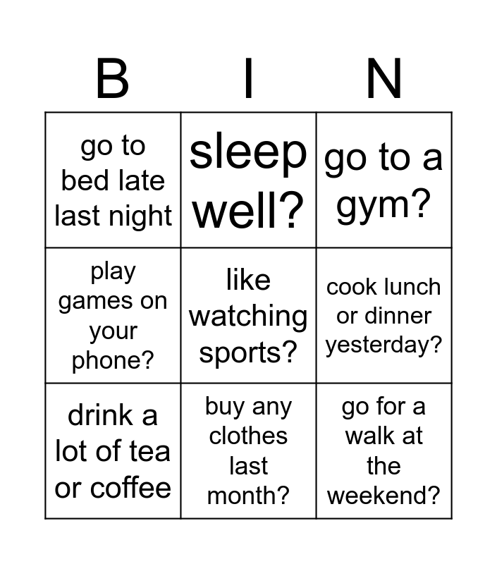 This bingo card has a free space and 9 words: drink a lot of tea or coffee, go to a gym?, sleep well?, play games on your phone?, go to bed late last night, cook lunch or dinner yesterday?, go for a walk at the weekend?, see a good film last week? and buy any clothes last month?.