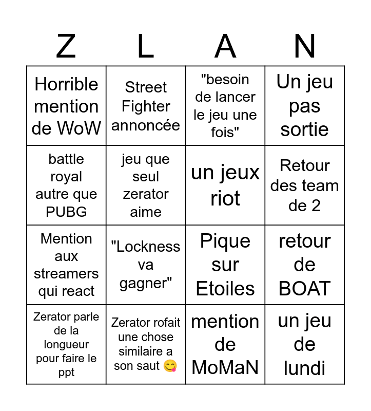 This bingo card has 19 words: Pique sur Etoiles, Rappel que ZQCD n'est pas a zerator, "besoin de lancer le jeu une fois", un jeu de lundi, retour de BOAT, battle royal autre que PUBG, mention de MoMaN, Horrible mention de WoW, Street Fighter annoncée, Mention aux streamers qui react, "Lockness va gagner", jeu que seul zerator aime, un jeux riot, Zerator rofait une chose similaire a son saut 😋, Zerator parle de la longueur pour faire le ppt, Une feinte sur un jeux, Un jeu pas sortie, Retour des team de 2 and Un jeu rovient.