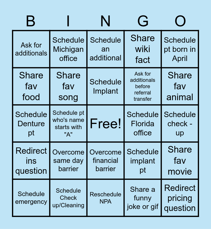 This bingo card has a free space and 24 words: Overcome same day barrier, Schedule Check up/Cleaning, Schedule Implant, Schedule emergency, Schedule pt born in April, Ask for additionals, Share fav food, Schedule Michigan office, Schedule Florida office, Overcome financial barrier, Ask for additionals before referral transfer, Schedule Denture pt, Schedule implant pt, Share fav movie, Share fav song, Share a funny joke or gif, Schedule check - up, Schedule an additional, Share fav animal, Schedule pt who's name starts with "A", Redirect pricing question, Redirect ins question, Share wiki fact and Reschedule NPA.