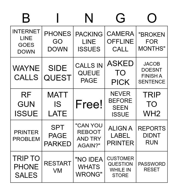 This bingo card has a free space and 24 words: SPT PAGE PARKED, RESTART VM, CALLS IN QUEUE PAGE, TRIP TO PHONE SALES, "BROKEN FOR MONTHS", INTERNET LINE GOES DOWN, WAYNE CALLS, PHONES GO DOWN, NEVER BEFORE SEEN ISSUE, "CAN YOU REBOOT AND TRY AGAIN?", ASKED TO PICK, RF GUN ISSUE, ALIGN A LABEL PRINTER, REPORTS DIDNT RUN, SIDE QUEST, CUSTOMER QUESTION WHILE IN STORE, TRIP TO WH2, PACKING LINE ISSUES, JACOB DOESNT FINISH A SENTENCE, MATT IS LATE, PASSWORD RESET, PRINTER PROBLEM, CAMERA OFFLINE CALL and "NO IDEA WHATS WRONG".