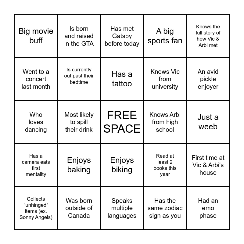 This bingo card has a free space and 24 words: Enjoys baking, Was born outside of Canada, Has a tattoo, Collects "unhinged" items (ex. Sonny Angels), Knows the full story of how Vic & Arbi met, Big movie buff, Went to a concert last month, Is born and raised in the GTA, Knows Arbi from high school, Enjoys biking, Knows Vic from university, Who loves dancing, Read at least 2 books this year, First time at Vic & Arbi's house, Is currently out past their bedtime, Has the same zodiac sign as you, Just a weeb, Has met Gatsby before today, An avid pickle enjoyer, Most likely to spill their drink, Had an emo phase, Has a camera eats first mentality, A big sports fan and Speaks multiple languages.