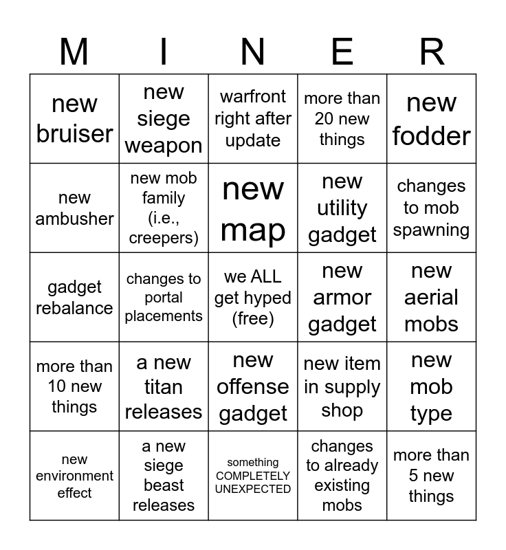 This bingo card has a free space and 24 words: a new titan releases, a new siege beast releases, new map, new environment effect, new fodder, new bruiser, new ambusher, new siege weapon, new armor gadget, new offense gadget, new utility gadget, gadget rebalance, new item in supply shop, new mob type, new mob family (i.e., creepers), changes to already existing mobs, new aerial mobs, warfront right after update, changes to mob spawning, changes to portal placements, more than 5 new things, more than 10 new things, more than 20 new things and something COMPLETELY UNEXPECTED.
