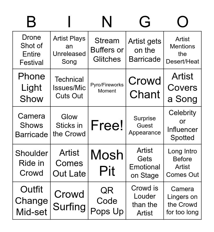 This bingo card has a free space and 24 words: Artist Comes Out Late, Crowd Surfing, Pyro/Fireworks Moment, Outfit Change Mid-set, Artist Mentions the Desert/Heat, Drone Shot of Entire Festival, Phone Light Show, Artist Plays an Unreleased Song, Surprise Guest Appearance, Mosh Pit, Crowd Chant, Camera Shows Barricade, Artist Gets Emotional on Stage, Long Intro Before Artist Comes Out, Technical Issues/Mic Cuts Out, Crowd is Louder than the Artist, Celebrity or Influencer Spotted, Stream Buffers or Glitches, Artist Covers a Song, Glow Sticks in the Crowd, Camera Lingers on the Crowd for too long, Shoulder Ride in Crowd, Artist gets on the Barricade and QR Code Pops Up.