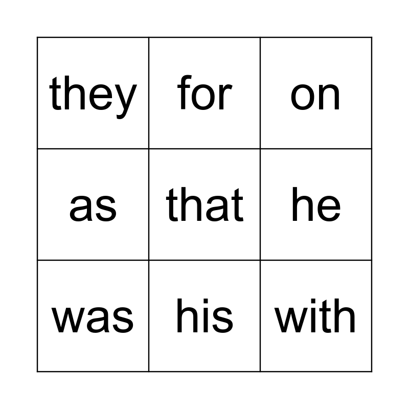 This bingo card has a free space and 8 words: he, on, for, was, they, with, as and his.
