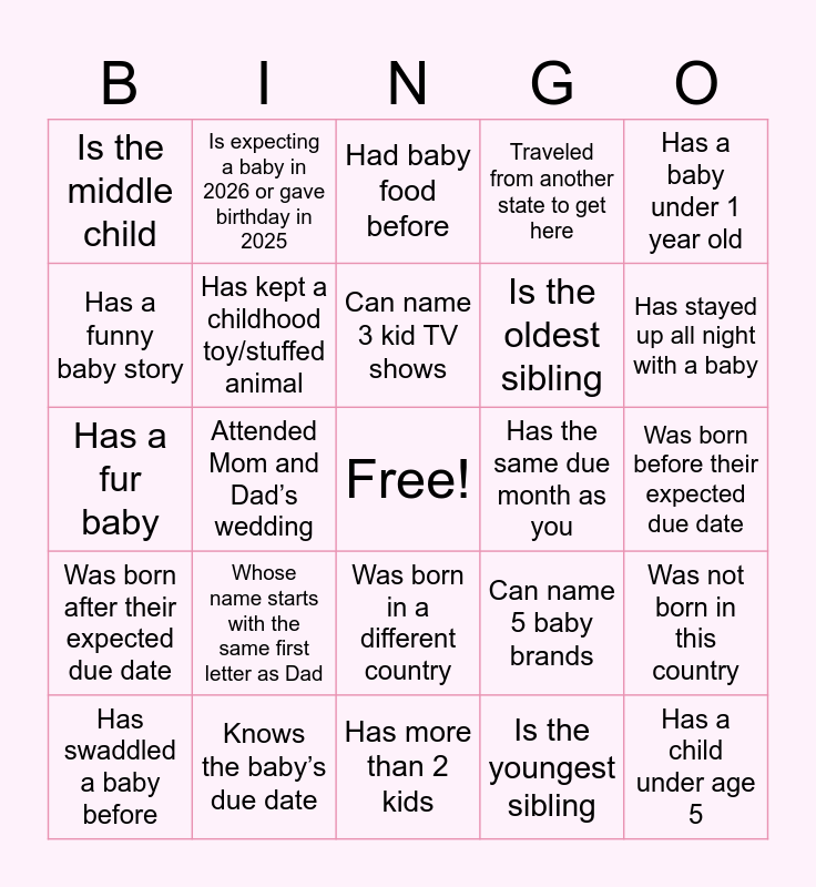 This bingo card has a free space and 51 words: Has changed a diaper before, Has a child under age 5, Is a first-time mom, Has more than 2 kids, Whose name starts with the same first letter as Dad, Whose name starts with the same first letter as Mom, Is expecting a baby in 2026 or gave birthday in 2025, Is afraid of holding a newborn, Has a funny baby story, Wearing pink today, Has kept a childhood toy/stuffed animal, Traveled from another state to get here, Was not born in this country, Can name 5 baby brands, Is a grandma, Is a grandpa, Can name 3 kid TV shows, Has the same due month as you, Has been pregnant in summer before, Has a baby under 1 year old, Attended Mom and Dad’s wedding, Is the youngest sibling, Is the middle child, Is the oldest sibling, Can sing a lullaby on the spot, Has a nickname from childhood still used today, Has stayed up all night with a baby, Has hosted a baby shower before, Has swaddled a baby before, Had baby food before, Has babysat an infant, Has experienced morning sickness, Has felt the baby kick, Has been to more than one baby shower, Has installed a car seat, Knows the baby’s due date, Has checked the baby registry more than once, Has a sweet tooth like Mom, Prefers savory like Dad, Has met their first baby, Remy, Was born before their expected due date, Was born after their expected due date, Shares a birth month with Dad, Shares a birth month with Mom, Has fallen asleep holding a baby, Has helped decorate a nursery, Has a fur baby, Is wearing something floral, Was born with a full head of hair, Was born in a different country and Was named after someone.