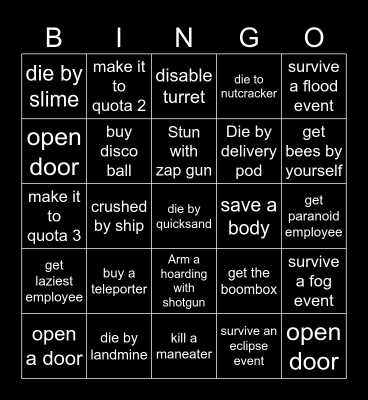 This bingo card has a free space and 26 words: Arm a hoarding with shotgun, survive an eclipse event, Stun with zap gun, die by landmine, survive a flood event, die by slime, open door, make it to quota 2, get paranoid employee, get the boombox, Die by delivery pod, make it to quota 3, survive a fog event, open a door, crushed by ship, die to giant, die to nutcracker, get laziest employee, disable turret, open door, get bees by yourself, kill a maneater, save a body, buy a teleporter, buy disco ball and buy boombox.