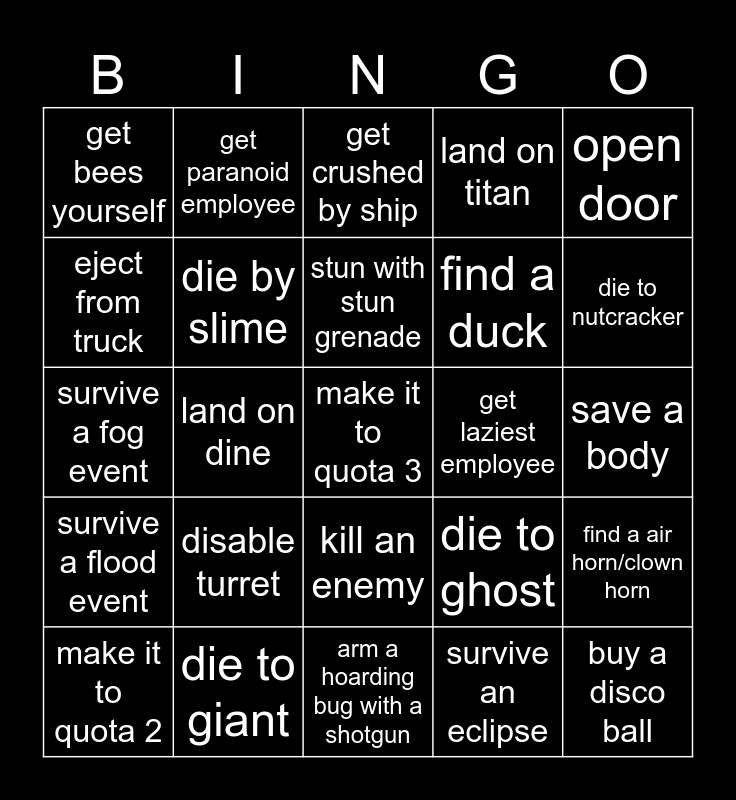 This bingo card has a free space and 34 words: die by hoarding bug, survive an eclipse, stun with zap gun, die by landmine, survive a flood event, die by slime, open door, make it to quota 2, get paranoid employee, get the boombox, stun with stun grenade, get crushed by ship, die to quicksand, survive a storm event, get laziest employee, die to nutcracker, die to giant, survive a fog event, disable turret, die to ghost, kill an enemy, get most profitable, get bees yourself, save a body, arm a hoarding bug with a shotgun, buy a disco ball, land on titan, escape a giant, find a duck, eject from truck, find a fire exit after going into main, land on dine, find a air horn/clown horn and make jeb mad.