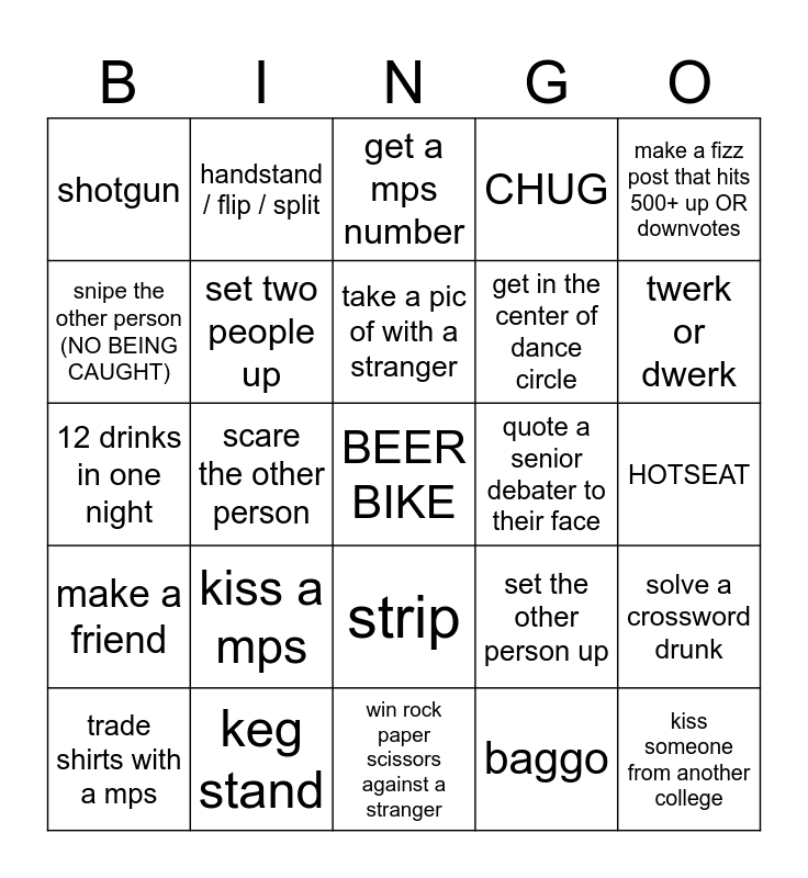 This bingo card has a free space and 24 words: kiss a mps, keg stand, take a pic of with a stranger, trade shirts with a mps, make a fizz post that hits 500+ up OR downvotes, shotgun, snipe the other person (NO BEING CAUGHT), handstand / flip / split, quote a senior debater to their face, strip, get in the center of dance circle, 12 drinks in one night, set the other person up, solve a crossword drunk, set two people up, baggo, HOTSEAT, get a mps number, twerk or dwerk, scare the other person, kiss someone from another college, make a friend, CHUG and win rock paper scissors against a stranger.