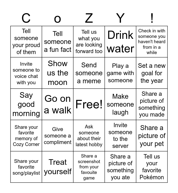 This bingo card has a free space and 24 words: Give someone a compliment, Treat yourself, Send someone a meme, Share your favorite song/playlist, Check in with someone you haven't heard from in a while, Tell someone your proud of them, Invite someone to voice chat with you, Tell someone a fun fact, Make someone laugh, Ask someone about their latest hobby, Play a game with someone, Say good morning, Invite someone to the server, Share a picture of your pet, Show us the moon, Share a picture of something you ate, Share a picture of something you made, Tell us what you are looking forward too, Set a new goal for the year, Go on a walk, Tell us your favorite Pokémon, Share your favorite memory of Cozy Corner, Drink water and Share a screenshot from your favouite game.