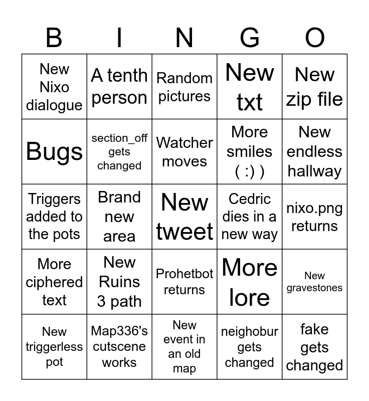 This bingo card has a free space and 24 words: New Ruins 3 path, Map336's cutscene works, Watcher moves, New triggerless pot, New zip file, New Nixo dialogue, Bugs, A tenth person, Cedric dies in a new way, Prohetbot returns, More smiles ( :) ), Triggers added to the pots, More lore, New gravestones, section_off gets changed, neighobur gets changed, nixo.png returns, Random pictures, New endless hallway, Brand new area, fake gets changed, More ciphered text, New txt and New event in an old map.