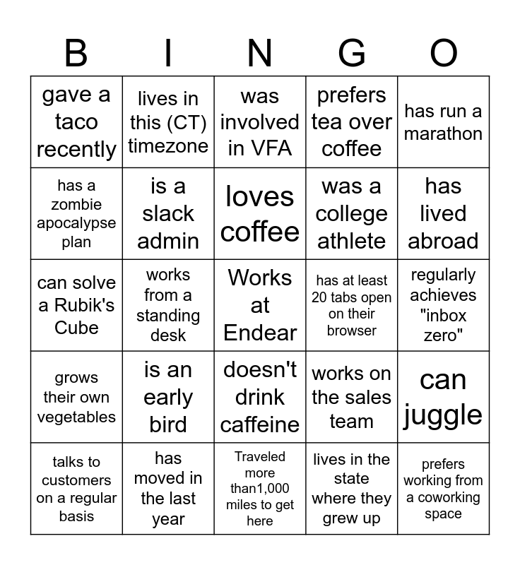 This bingo card has a free space and 39 words: is left handed, has <1 year of tenure, has >3 years of tenure, is a slack admin, talks to customers on a regular basis, doesn't drink caffeine, loves coffee, speaks 2+ languages, has run a marathon, grows their own vegetables, works from a standing desk, prefers tea over coffee, prefers working from a coworking space, regularly achieves "inbox zero", has at least 20 tabs open on their browser, is an early bird, is a night owl, gave a taco recently, works on the product & engineering team, works on the sales team, has a zombie apocalypse plan, Traveled more than1,000 miles to get here, was a college athlete, has lived abroad, has a pet that isn't a cat or dog, has a birthday this month, has never broken a bone, takes meetings while walking, works with a pet in their lap, lives in this (CT) timezone, listens to music while working, turns on dark mode everywhere, was involved in VFA, has moved in the last year, lives in the state where they grew up, plays a musical instrument, can juggle, can solve a Rubik's Cube and believes in aliens.