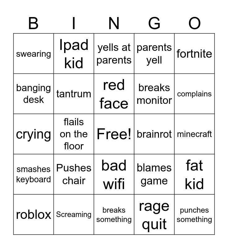 This bingo card has a free space and 24 words: Pushes chair, Screaming, red face, roblox, fortnite, swearing, banging desk, Ipad kid, brainrot, bad wifi, breaks monitor, crying, blames game, fat kid, tantrum, rage quit, minecraft, yells at parents, complains, flails on the floor, punches something, smashes keyboard, parents yell and breaks something.