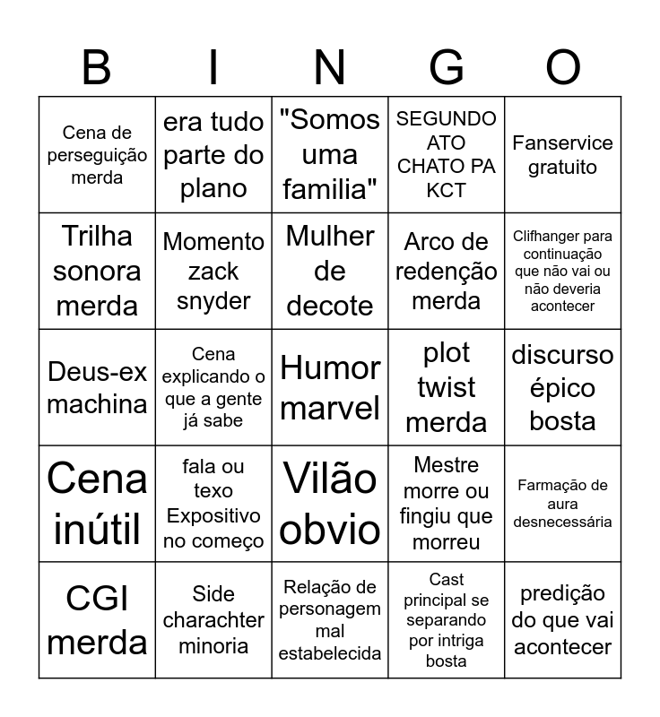 This bingo card has a free space and 24 words: fala ou texo Expositivo no começo, Side charachter minoria, Mulher de decote, CGI merda, Fanservice gratuito, Cena de perseguição merda, Trilha sonora merda, era tudo parte do plano, plot twist merda, Vilão obvio, Arco de redenção merda, Deus-ex machina, Mestre morre ou fingiu que morreu, Farmação de aura desnecessária, Momento zack snyder, Cast principal se separando por intriga bosta, discurso épico bosta, "Somos uma familia", Clifhanger para continuação que não vai ou não deveria acontecer, Cena explicando o que a gente já sabe, predição do que vai acontecer, Cena inútil, SEGUNDO ATO CHATO PA KCT and Relação de personagem mal estabelecida.