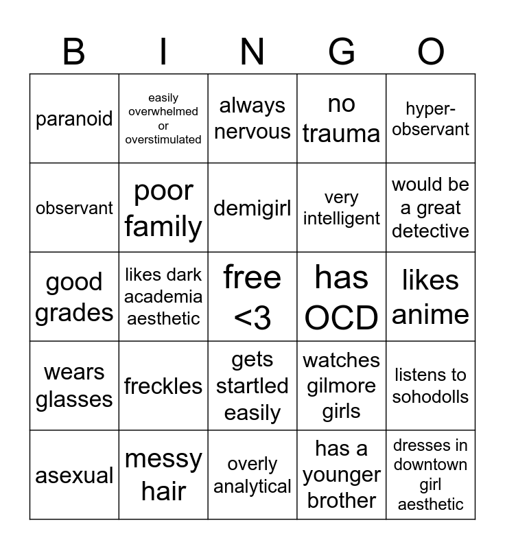 This bingo card has a free space and 24 words: freckles, messy hair, demigirl, asexual, hyper-observant, paranoid, observant, easily overwhelmed or overstimulated, has OCD, gets startled easily, very intelligent, good grades, watches gilmore girls, listens to sohodolls, poor family, has a younger brother, likes anime, always nervous, would be a great detective, likes dark academia aesthetic, dresses in downtown girl aesthetic, wears glasses, no trauma and overly analytical.