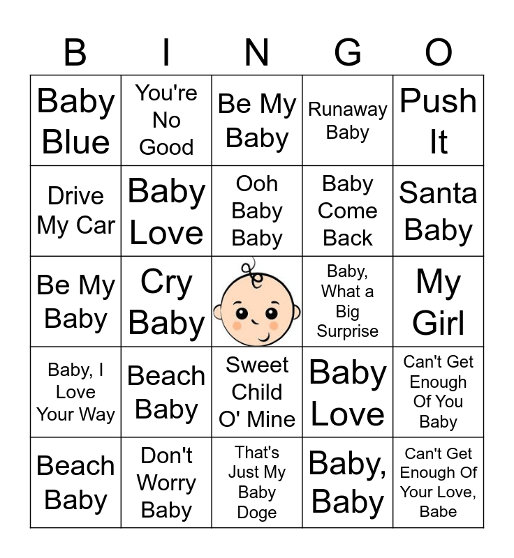 This bingo card has a free space and 103 words: Hot In Herre, The Final Countdown, Push It, I'm Coming Out, Born in the U.S.A., Get the Party Started, Born This Way, Sweet Child O' Mine, My Girl, She Will Be Loved, Baby Shark, ...Baby One More Time, (You're) Having My Baby, Baby, I Got You Babe, You're No Good, Be My Baby, Cry Baby, That's Just My Baby Doge, Baby, I Love Your Way, Come on over Baby, Ice Ice Baby, Hey Baby, Hey Baby-Drop It to the Floor, Hey! Baby, Beach Baby, Santa Baby, Runaway Baby, There Goes My Baby, Baby Got Back, Baby Love, Baby, Baby, Baby, What a Big Surprise, The Baby in the Bath, Bye Bye Baby, Somebody's Baby, Rock Your Baby, Baby, It's Cold Outside, Ooh Baby Baby, Don't Worry Baby, Can't Get Enough Of You Baby, Baby, I Love Your Way, Baby Hold On, Drive My Car, Baby Come Back, Baby Blue, I'm Your Baby Tonight, Can't Get Enough Of Your Love, Babe, Babydoll, Baby Jane, Baby I Love Your Way, Everything She Wants, Hot In Herre, The Final Countdown, Push It, I'm Coming Out, Born in the U.S.A., Get the Party Started, Born This Way, Sweet Child O' Mine, My Girl, She Will Be Loved, Baby Shark, ...Baby One More Time, (You're) Having My Baby, Baby, I Got You Babe, You're No Good, Be My Baby, Cry Baby, That's Just My Baby Doge, Baby, I Love Your Way, Come on over Baby, Ice Ice Baby, Hey Baby, Hey Baby-Drop It to the Floor, Hey! Baby, Beach Baby, Santa Baby, Runaway Baby, There Goes My Baby, Baby Got Back, Baby Love, Baby, Baby, Baby, What a Big Surprise, The Baby in the Bath, Bye Bye Baby, Somebody's Baby, Rock Your Baby, Baby, It's Cold Outside, Ooh Baby Baby, Don't Worry Baby, Can't Get Enough Of You Baby, Baby, I Love Your Way, Baby Hold On, Drive My Car, Baby Come Back, Baby Blue, I'm Your Baby Tonight, Can't Get Enough Of Your Love, Babe, Babydoll, Baby Jane and Everything She Wants.