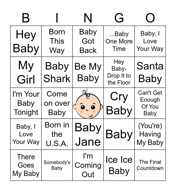 This bingo card has a free space and 51 words: Hot In Herre, The Final Countdown, Push It, I'm Coming Out, Born in the U.S.A., Get the Party Started, Born This Way, Sweet Child O' Mine, My Girl, She Will Be Loved, Baby Shark, ...Baby One More Time, (You're) Having My Baby, Baby, I Got You Babe, You're No Good, Be My Baby, Cry Baby, That's Just My Baby Doge, Baby, I Love Your Way, Come on over Baby, Ice Ice Baby, Hey Baby, Hey Baby-Drop It to the Floor, Hey! Baby, Beach Baby, Santa Baby, Runaway Baby, There Goes My Baby, Baby Got Back, Baby Love, Baby, Baby, Baby, What a Big Surprise, The Baby in the Bath, Bye Bye Baby, Somebody's Baby, Rock Your Baby, Baby, It's Cold Outside, Ooh Baby Baby, Don't Worry Baby, Can't Get Enough Of You Baby, Baby, I Love Your Way, Baby Hold On, Drive My Car, Baby Come Back, Baby Blue, I'm Your Baby Tonight, Can't Get Enough Of Your Love, Babe, Babydoll, Baby Jane and Everything She Wants.